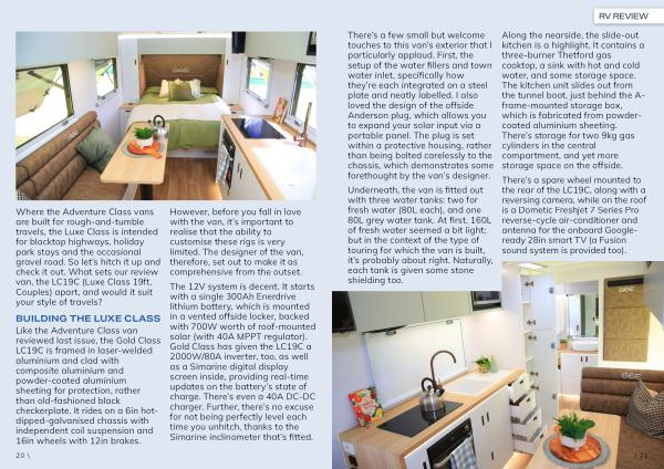 There’ s a spare wheel mounted to the rear of the LC19C, along with a reversing camera, while on the roof is a Dometic Freshjet 7 Series Pro reverse-cycle air-conditioner and antenna for the onboard Googleready 28in smart TV( a Fusion sound system is provided too).