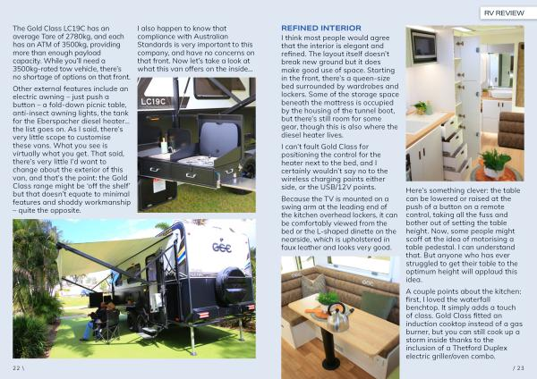 Other external features include an electric awning – just push a button – a fold-down picnic table, anti-insect awning lights, the tank for the Eberspacher diesel heater … the list goes on. As I said, there’ s very little scope to customise these vans. What you see is virtually what you get. That said, there’ s very little I’ d want to change about the exterior of this van, and that’ s the point: the Gold Class range might be‘ off the shelf’ but that doesn’ t equate to minimal features and shoddy workmanship – quite the opposite.