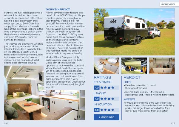 Have I covered every feature and detail of the LC19C? No, but I hope that I’ ve given you enough of a tour that you’ ll take a look for yourself. From a value for money perspective, it’ s a solid proposition. No, you won’ t be forging new trails in the bush, or eyeing off Gunshot … but the LC19C by new name Gold Class Caravans offers all the features and comforts inside a well-made caravan that demonstrates excellent attention to detail. There was no aspect of this van that made me cringe or wonder what they were thinking.