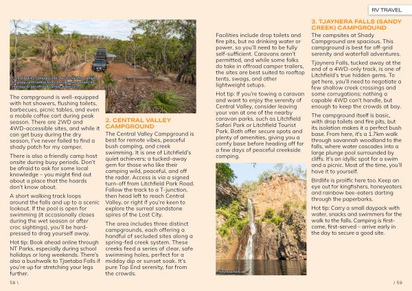 The area includes three distinct campgrounds, each offering a handful of secluded sites along a spring-fed creek system. These creeks feed a series of clear, safe swimming holes, perfect for a midday dip or sunset soak. It’ s pure Top End serenity, far from the crowds.