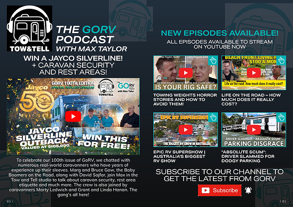 To celebrate our 100th issue of GoRV, we chatted with numerous real-world caravanners who have years of experience up their sleeves. Marg and Bruce Gow, the Baby Boomers on the Road, along with David Sajfar, join Max in the Tow and Tell studio to talk about caravan security, rest area etiquette and much more. The crew is also joined by caravanners Marty Ledwich and Grant and Linda Hanan. The gang ' s all here!