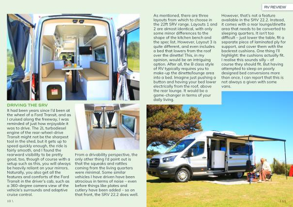 As mentioned, there are three layouts from which to choose in the 22ft SRV range. Layouts 1 and 2 are almost identical, with only some minor differences to the shape of the kitchen bench and the spec list. However, Layout 3 is quite different, and even includes a bed that lowers from the roof over the dinette! This, in my opinion, would be an intriguing option. After all, the B class style of RV typically requires you to make-up the dinette / lounge area into a bed. Imagine just pushing a button and having your bed lower electrically from the roof, above the rear lounge. It would be a game-changer in terms of your daily living.