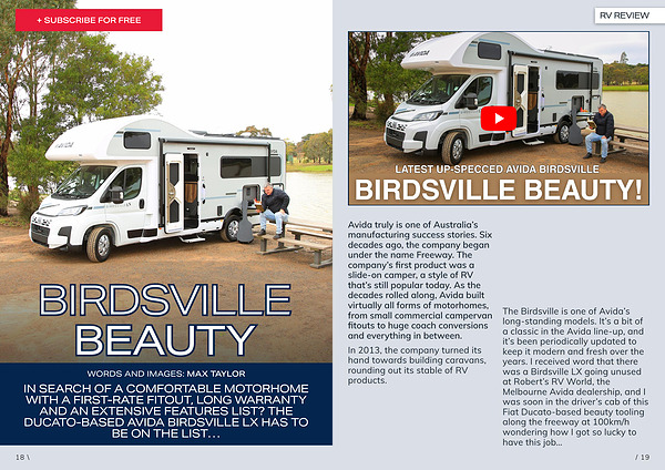 The Birdsville is one of Avida’ s long-standing models. It’ s a bit of a classic in the Avida line-up, and it’ s been periodically updated to keep it modern and fresh over the years. I received word that there was a Birdsville LX going unused at Robert’ s RV World, the Melbourne Avida dealership, and I was soon in the driver’ s cab of this Fiat Ducato-based beauty tooling along the freeway at 100km / h wondering how I got so lucky to have this job …