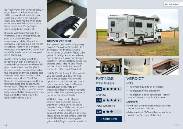 With its Luton peak, elegant kitchen and bedroom area, a bathroom that’ s very functional despite being a little narrow, not to mention the drivability and comfort of the Ducato, I’ d say you really could not go wrong with the Avida Birdsille LX. My biggest gripe: I didn’ t get more time with it!
