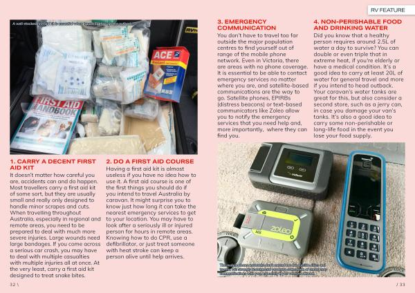 Did you know that a healthy person requires around 2.5L of water a day to survive? You can double or even triple that in extreme heat, if you ' re elderly or have a medical condition. It’ s a good idea to carry at least 20L of water for general travel and more if you intend to head outback. Your caravan’ s water tanks are great for this, but also consider a second store, such as a jerry can, in case you damage your van’ s tanks. It’ s also a good idea to carry some non-perishable or long-life food in the event you lose your food supply.