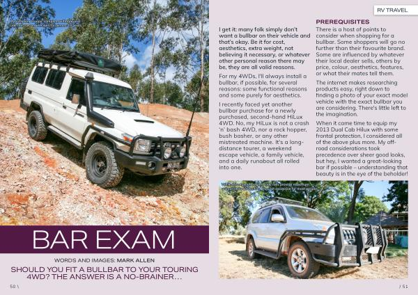 I recently faced yet another bullbar purchase for a newly purchased, second-hand HiLux 4WD. No, my HiLux is not a crash‘ n’ bash 4WD, nor a rock hopper, bush basher, or any other mistreated machine. It ' s a longdistance tourer, a weekend escape vehicle, a family vehicle, and a daily runabout all rolled into one.