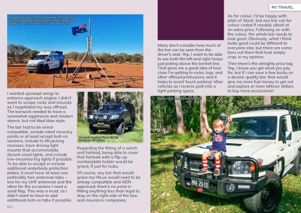 The bar had to be winch compatible, include rated recovery points or at least accept bolt-on versions, include hi-lift jacking recesses, have driving light mounts that accommodate decent-sized lights, and include low-mounted fog lights if possible. To be able to accept or include additional underbody protection plates, it must have at least one, preferably two antennae tabs – one for my UHF antennae and the other for the occasions I need a sand flag. This was a must, as I didn’ t want to have to add additional bolt-on tabs if possible.