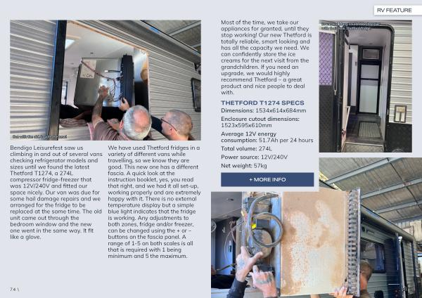 Bendigo Leisurefest saw us climbing in and out of several vans checking refrigerator models and sizes until we found the latest Thetford T1274, a 274L compressor fridge-freezer that was 12V / 240V and fitted our space nicely. Our van was due for some hail damage repairs and we arranged for the fridge to be replaced at the same time. The old unit came out through the bedroom window and the new one went in the same way. It fit like a glove.