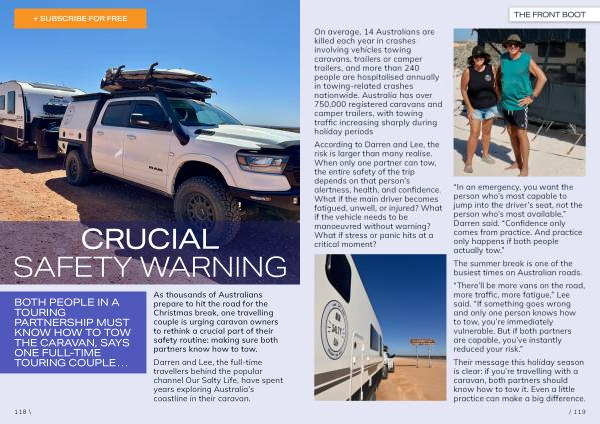 On average, 14 Australians are killed each year in crashes involving vehicles towing caravans, trailers or camper trailers, and more than 240 people are hospitalised annually in towing-related crashes nationwide. Australia has over 750,000 registered caravans and camper trailers, with towing traffic increasing sharply during holiday periods