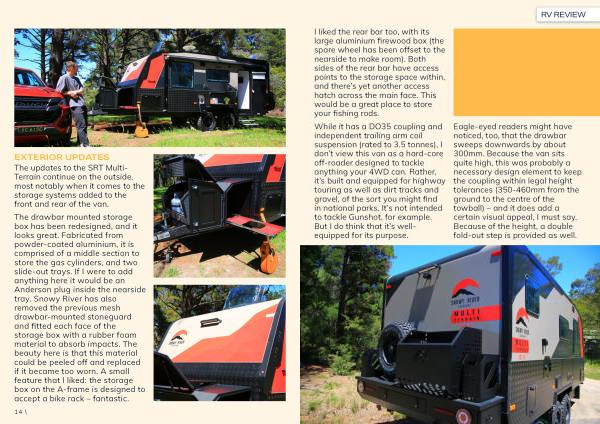 The drawbar mounted storage box has been redesigned, and it looks great. Fabricated from powder-coated aluminium, it is comprised of a middle section to store the gas cylinders, and two slide-out trays. If I were to add anything here it would be an Anderson plug inside the nearside tray. Snowy River has also removed the previous mesh drawbar-mounted stoneguard and fitted each face of the storage box with a rubber foam material to absorb impacts. The beauty here is that this material could be peeled off and replaced if it became too worn. A small feature that I liked: the storage box on the A-frame is designed to accept a bike rack – fantastic.