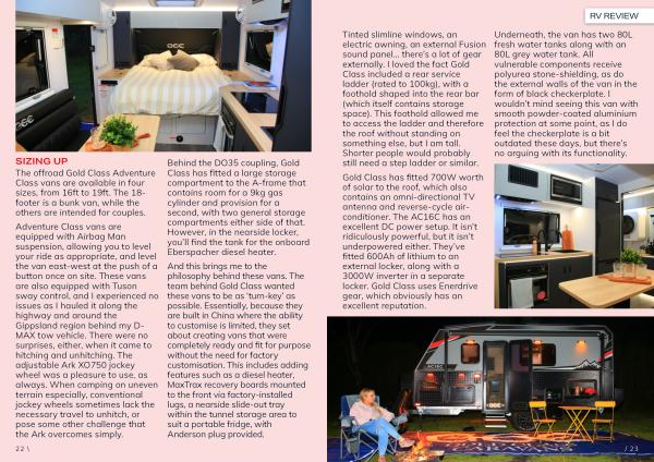 Tinted slimline windows, an electric awning, an external Fusion sound panel … there’ s a lot of gear externally. I loved the fact Gold Class included a rear service ladder( rated to 100kg), with a foothold shaped into the rear bar( which itself contains storage space). This foothold allowed me to access the ladder and therefore the roof without standing on something else, but I am tall. Shorter people would probably still need a step ladder or similar.
