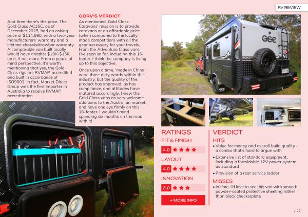 Once upon a time,‘ made in China’ were three dirty words within this industry, but the quality of the product has improved, as has compliance, and attitudes have matured accordingly. I view the Gold Class vans as very welcome additions to the Australian market, and have one eye firmly on this 16-footer. I wouldn’ t mind spending six months on the road with it!