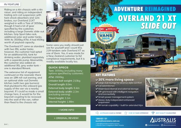 Some vans you really should just see for yourself and I count this 21ft tandem-axle Overland XT as one of them. Yes, it was made for a New Zealand customer to NZ compliance requirements, but it is readily available locally too.