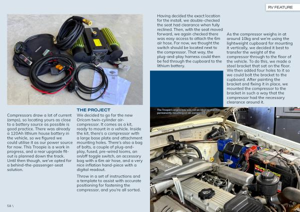 We decided to go for the new Oricom twin-cylinder aircompressor. It comes as a kit, ready to mount in a vehicle. Inside the kit, there’ s a compressor with a large base plate and attachment mounting holes. There’ s also a bag of bolts, a couple of plug-andplay, fused, pre-wired looms, an on / off toggle switch, an accessory bag with a 6m air hose, and a very nice inflation hand-piece with a digital readout.