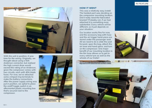 With the unit in position, it was time for the wiring. Originally, we thought about using a 50A Anderson connector, but realised the high current draw would exceed the rating of an Anderson, given the compressor comes with two circuits, each with 40A blade fuses. For now, we’ ve attached some crimped ring terminals to make the battery connections. After the power supply wiring was put in position, we opted to place the on / off toggle switch in an aftermarket plastic mounting box that’ s secured next to the compressor.
