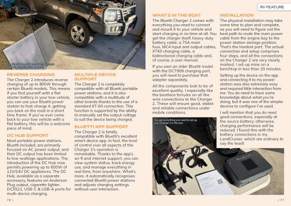 The Charger 2 introduces reverse charging of up to 800W through certain Bluetti models. This means if you find yourself with a flat starter battery in your tow vehicle, you can use your Bluetti power station to fast-charge it, getting you back on the road in a short time frame. If you’ ve ever come back to your tow vehicle with a flat battery, this will be a welcome piece of mind.