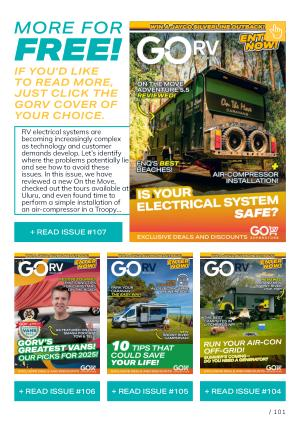 RV electrical systems are becoming increasingly complex as technology and customer demands develop. Let’ s identify where the problems potentially lie and see how to avoid these issues. In this issue, we have reviewed a new On the Move, checked out the tours available at Uluru, and even found time to perform a simple installation of an air-compressor in a Troopy …