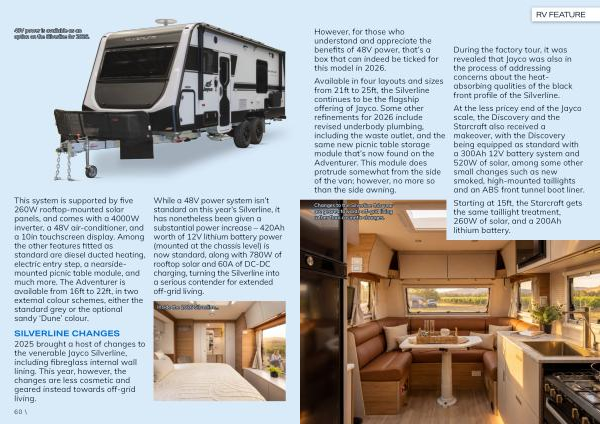 Available in four layouts and sizes from 21ft to 25ft, the Silverline continues to be the flagship offering of Jayco. Some other refinements for 2026 include revised underbody plumbing, including the waste outlet, and the same new picnic table storage module that’ s now found on the Adventurer. This module does protrude somewhat from the side of the van; however, no more so than the side awning.