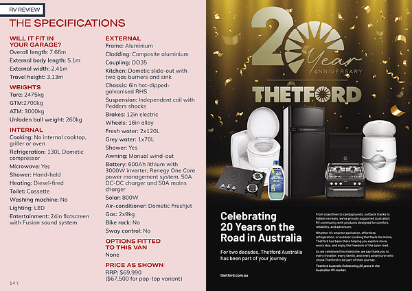 Solar: 800W Air-conditioner: Dometic Freshjet Gas: 2x9kg Bike rack: No Sway control: No