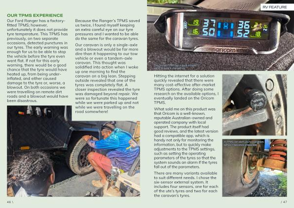 Our Ford Ranger has a factoryfitted TPMS; however, unfortunately it does not provide tyre temperature. This TPMS has previously, on two separate occasions, detected punctures in our tyres. The early warning was enough for us to be able to stop the vehicle before the tyre even went flat. If not for this early warning, there would be a good chance that the tyre would have heated up, from being underinflated, and either caused damage to the tyre or, worse, a blowout. On both occasions we were travelling on remote dirt roads and a blowout would have been disastrous.