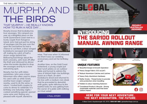 Murphy knows that kookaburras love sausages . We camped one year at a delightful place on the north Queensland coast next to a lovely couple from Kangaroo Island . John had just put his string of sausages into the pan over the open fire and before he had a chance to cut them , a blue-winged kookaburra swooped and made off , trailing his catch of half a dozen snags behind him . Bellowing bad things about the bird ' s ancestry , John took off after the thief and retrieved his dinner when the kookie decided to drop the sausages and fly to a more welcoming spot . Murphy has fun with dates sometimes . John was a keen fisherman who often used to share his catch with us while Grant , another keen angler camped nearby , used to do the same . In return , I invited both couples to come to dinner to celebrate Vi ' s birthday one Saturday night . I cooked something special , opened some wine and , feeling very pleased with myself , started to relax . That was when Vi informed me that it was our wedding anniversary and not her birthday at all !