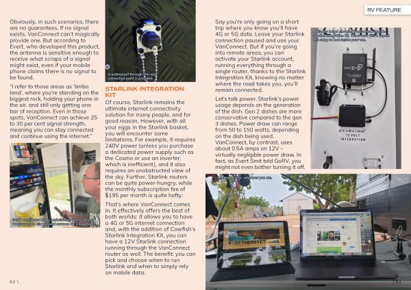 That ’ s where VanConnect comes in . It effectively offers the best of both worlds : it allows you to have a 4G or 5G internet connection and , with the addition of Cowfish ’ s Starlink Integration Kit , you can have a 12V Starlink connection running through the VanConnect router as well . The benefit : you can pick and choose when to run Starlink and when to simply rely on mobile data .