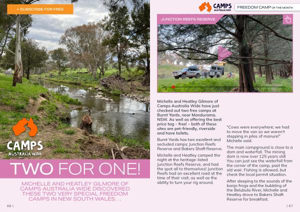Michelle and Heatley Gilmore of Camps Australia Wide have just checked out two free camps at Burnt Yards , near Mandurama , NSW . As well as offering the best price tag – free ! – both of these sites are pet-friendly , riverside and have toilets .