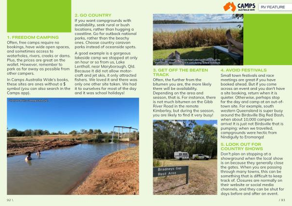 Small town festivals and race meetings are great if you have booked ahead . But if you come across an event and you don ' t have a site booking , return when it is quieter . Otherwise , perhaps stop for the day and camp at an out-oftown site . For example , south western Queensland is super busy around the Birdsville Big Red Bash , when about 10,000 campers arrive ! It is just not Birdsville that is pumping : when we travelled , campgrounds were hectic from Nindigully to Eromanga !