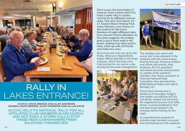 Once a year, the Association of Caravan Clubs Victoria( ACCVic) hosts a state rally in country Victoria for its affiliated caravan clubs. This year, from March 14- 17, Eastern Beach Holiday Park, Lakes Entrance, was chosen as the location for the event. Members of eight affiliated clubs from around Victoria attended. As the name suggests, the holiday park is just a short walk to the beach, making it an ideal spot to relax, catch up with old friends and make new ones.